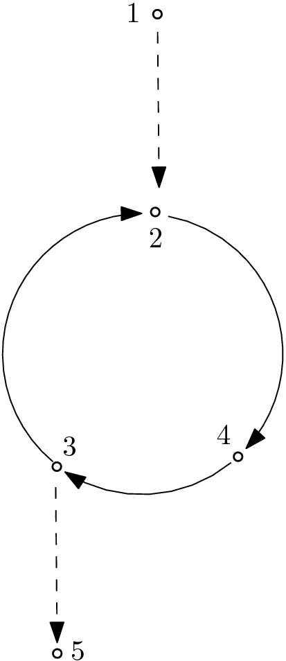 Wyjaśnienie do przykładu: Kółka na powyższych rysunkach przedstawiają wierzchołki, odcinki - krawędzie grafu, a odcinki przerywane - dodatkowe krawędzie. W pierwszym przykładzie po dodaniu dowolnych dwóch krawędzi graf zawiera dokładnie jeden cykl prosty, natomiast w drugim stworzenie grafu z dokładnie jednym cyklem prostym nie jest możliwe.