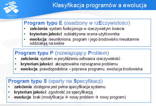 W kontekście pielęgnacji oprogramowania, Lehman wprowadził prosty podział programów na trzy kategorie: