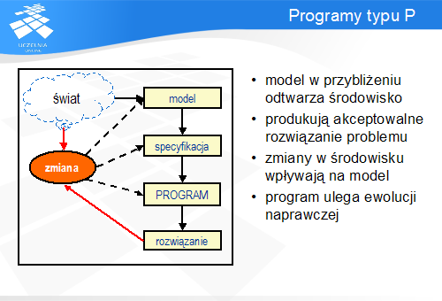 Kategorią programów, która w większym stopniu nawiązuje do rzeczywistości rozwoju i ewolucji oprogramowania, są programy typu P. Model budowany na podstawie obrazu środowiska (świata rzeczywistego) naśladuje pewne cechy tego środowiska, ale z natury jest niekompletny. Niepełność modelu jednak jest pożądaną cechą, ponieważ pozwala pomijać nieistotne elementy środowiska, a co za tym idzie – stosować to podejście do większych i bardziej złożonych zadań niż w przypadku programów typu S. Na podstawie modelu powstaje specyfikacja (również niepełna, z możliwymi sprzecznościami), a następnie program. Jeżeli w środowisku zachodzi zmiana, która wymaga odzwierciedlenia w programie, wówczas program podlega modyfikacji.