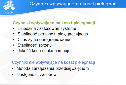 Aby uzmysłowić sobie istotę procesu pielęgnacji oprogramowania, warto przeanalizować powyższy wykres, przedstawiający dotychczasowy i prognozowany udział przedsięwzięć pielęgnacyjnych w stosunku do wszystkich przedsięwzięć związanych z oprogramowaniem. Wynika z niego, że udział liczby przedsięwzięć informatycznych, które dotyczą jedynie pielęgnacji istniejącego oprogramowania, stale rośnie, z ok. 10% w latach 50-tych, do ok. 60% obecnie. Trend ten, choć w mniejszym nasileniu, zostanie utrzymany w najbliższych latach i w roku 2020 osiągnie ok 67%