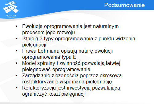 Podczas wykładu zaprezentowano podstawowe zagadnienia związane z ewolucją i pielęgnacją oprogramowania. Ewolucja jest procesem naturalnym i w praktycznych zastosowaniach nie da się jej uniknąć. Prawa Lehmana, opisujące naturę ewolucji jednej z kategorii oprogramowania, pokazują, że programy, które nie ewoluują, stają się coraz mniej użyteczne. Czynnikiem wspomagającym pielęgnację jest sterowanie ewolucją poprzez informację zwrotną płynącą ze środowiska. Dlatego cyklem życia szczególnie dobrze wspomagającym tę fazę rozwoju oprogramowania jest model spiralny.