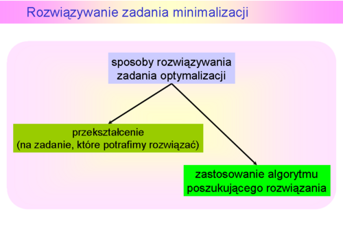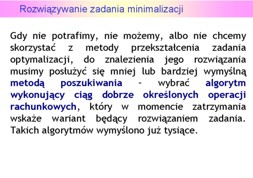 Ale matematyka nie dostarcza nam narzędzi pozwalających bezpośrednio to polecenie wypełnić. Brak bezpośrednich narzędzi pozwalających wprost znaleźć rozwiązanie zadania optymalizacji oznacza, że wtedy gdy chcemy je znaleźć drogą rachunkową musimy oryginalne sformułowanie przekształcićdo postaci pozwalającej na wykonanie stosownych rachunków. Jak się o tym przekonamy w wykładach następnych jest to najczęściej odpowiednio określonyukład równań i nierówności (obecność nierówności jest kłopotliwa), którego rozwiązanie jest (lub może być, warunek konieczny!) rozwiązaniem wyjściowego zadania optymalizacji.