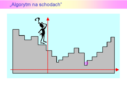 Przyjmujemy, że Algorytm całych schodów nie widzi, natomiast potrafi ocenić położenie każdego stopnia w stosunku do ustalonego poziomu odniesienia, nazwiemy je wysokością (dla każdego wariantu potrafi obliczyć wartość funkcji celu).