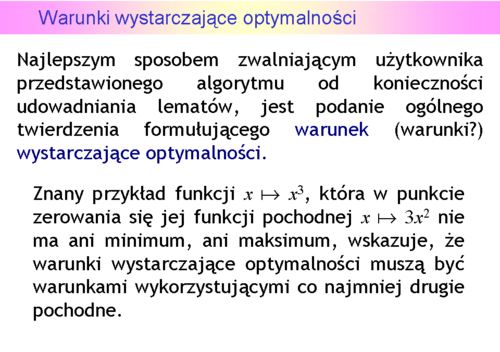 Piękny rezultat teoretyczny, sprowadzający procedurę redukcji do układu równań wyłącznie do rachunków: liczenia pochodnych i rozwiązywania równań, czyli do takiego postępowania, które zastosowaliśmy z ochotą lecz błędnie w przykładzie. Trzeba tylko policzyć macierz Hessego by stwierdzić wypukłość funkcji celu i zastanowić się nad sposobem rozwiązania stosownych równań, ale odpadają zagadnienia związane z dowodem istnienia rozwiązania.