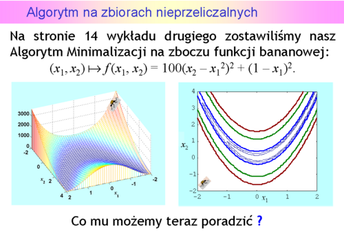 Widać, ze funkcja Rosenbrocka jest dobrze dobrana jako “tor badania sprawności” dla różnych algorytmów. Tylko w centralnej części (tam gdzie nie ma minimum) jej uwarunkowanie jest mniejsze od pięciu, a w okolicy minimum jest większe od 500.