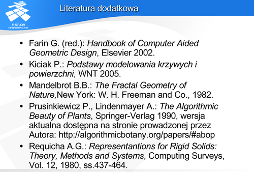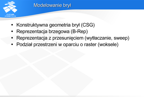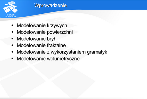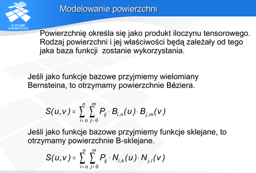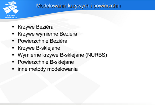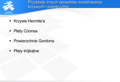 Istnieje wiele metod modelowania krzywych i powierzchni. Mają one różne właściwości i wymagają osobnego omówienia.