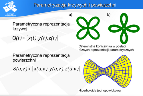 Wygodnym sposobem opisu krzywych i powierzchni jest opis parametryczny. W tym przypadku za pomocą doboru wartości parametru można zdefiniować dowolny fragment krzywej, a kierunek wzrostu parametru jednoznacznie określa np. kierunki stycznych połączonych fragmentów. Przykładowa czterolistna koniczynka jest narysowana na rysunku a) w postaci rozety czterolistnej :