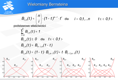 Rysunek przedstawia wykresy wielomianów Bernsteina 2, 3, 4 i 5 stopnia. Najczęściej mamy do czynienia z wielomianami stopnia 3. W tym przypadku: