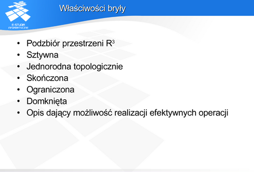 Zaproponowany zestaw właściwości bryły jest pewnym kompromisem między swobodą projektowania a zastosowaniami praktycznymi, kompromisem, który daje przy tym możliwość efektywnego wspomagania projektowania. Przykładem jak należy rozumieć ten kompromis jest jednorodność topologiczna. Z jednej strony nie ma w zasadzie żadnych przeciwwskazań w grafice komputerowej aby tworzyć obiekty niejednorodne (np. krzesło w postaci trójwymiarowego sześciennego siedziska połączonego z dwuwymiarowym prostokątnym oparciem). Ale jednocześnie ujednolicenie opisu może uprościć podejście do różnie definiowanych elementów. Natomiast jeśli popatrzymy na problem od strony praktycznej ; technologicznie realizacyjnej, to okaże się, że problem w zasadzie nie istnieje ponieważ żyjemy wśród obiektów trójwymiarowych jednorodnych topologicznie i praktyczne wykonanie prostokątnego oparcie dla rozpatrywanego krzesła i tak będzie wymagało określenia trzeciego wymiaru – jego grubości. Jeśli już nawet dla spełnienia wizji projektanta jest niezbędne istnienie niejednorodności topologicznej to prościej jest założyć, że w ramach jednej bryły zachowujemy jednorodność i w ostateczności dopuszczamy zestawienie różnych brył w ramach jednego procesu. Chociaż i tak w efekcie końcowym na etapie technologii zostanie to ujednolicone. Drugim elementem opisu właściwości bryły na który warto zwrócić uwagę jest domknięcie bryły. To co widzimy obserwując dowolny przedmiot jest efektem odbicia światła od powierzchni tego przedmiotu. Jeśli zostanie on przekrojony to zobaczymy powierzchnię przekroju – to znaczy będzie to nowy brzeg powstały przecięcia. Powierzchnia brzegu obiektu jest więc bardzo istotna w procesie rysowania – wizualizacji obiektu.