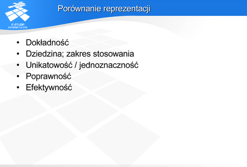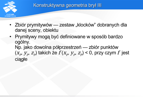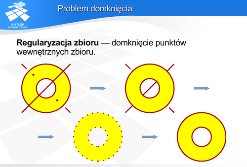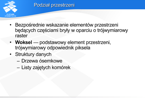 Poprawność. Podział przestrzeni jest zawsze poprawny – zawsze uzyskamy poprawny fragment przestrzeni. Pytanie oczywiście czy jest to ten fragment o który chodziło konstruktorowi. W pozostałych przypadkach wymagane jest sprawdzenie czy wynik definiowania/operacji jest poprawnym obiektem w danej klasie. Najtrudniejsze do sprawdzenia są opisy reprezentacji powierzchniowej.