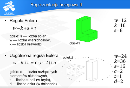 Dla modelu wielościennego istotnym problemem jest organizacja struktury danych zapamiętującej obiekt. Realizowane jest to w postaci list lub tablic ścian, krawędzi i wierzchołków. Pamiętanie powiązań między elementami obiektów prowadzi do struktur redundantnych. Wiąże się to oczywiście ze wzrostem kosztu pamięciowego. Czasami celowo wprowadzane są struktury redundantne w celu przyspieszenia wyszukania elementów. Takimi strukturami są na przykład DCEL (double connected edg list) i struktura krawędziowa Baumgarta. Są to struktury, w których deskryptory krawędzi zawierają wskazania na sąsiednie krawędzie, węzły i ściany.