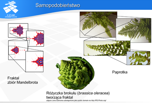 Rysunek z lewej strony pokazuje jeden z najbardziej znanych fraktali - tak zwany zbiór Mandelbrota. Zbiór ten powstaje przez interpretację barwami właściwości ciągu liczb zespolonych postaci