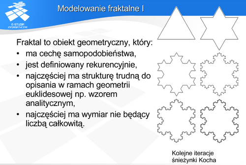 dążącym do zera. Wymiar Hausdorffa nigdy nie jest mniejszy niż wymiar topologiczny danego zbioru. Dla fraktali jest liczbą ułamkową. Sniezynka Kocha ma wymiar d=log4/log3=1,2618…