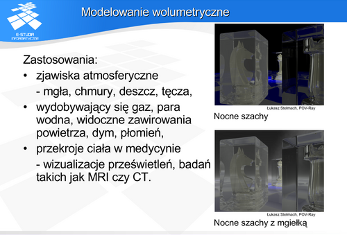 • Metody uproszczone. Wizualizacja za pomocą tekstur (dwuwymiarowych rzadziej trójwymiarowych). Wizualizacja za pomocą półprzepuszczalnych płaszczyzn (jednej lub kilku) z nałożonymi obrazami zjawiska. Metody te dają dobre efekty i są efektywnie obliczeniowo, ale związane są tylko z określonym kierunkiem patrzenia. Metody takie stosuje się do uproszczonego modelowania mgły i chmur oraz podobnych zjawisk (np. w grach komputerowych).