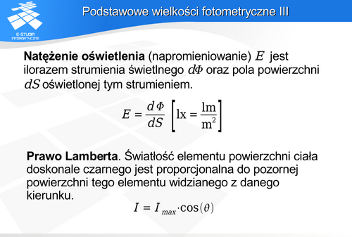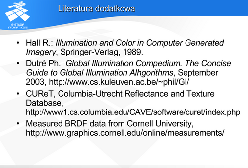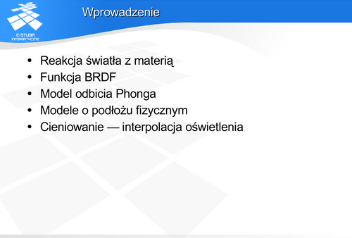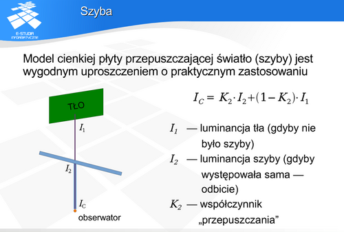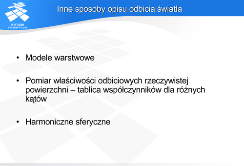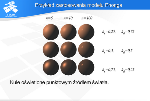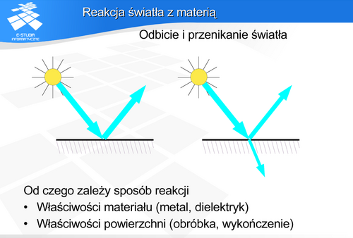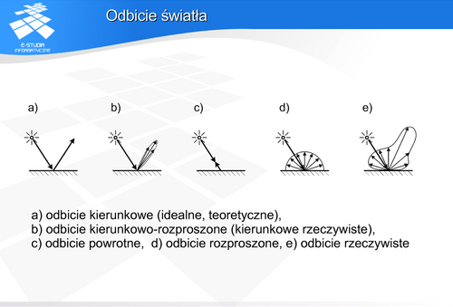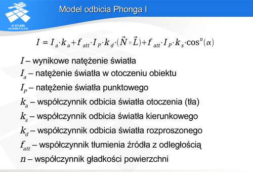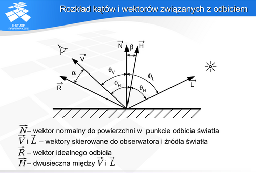 jest jednakowe dla wszystkich obiektów. Drugi składnik opisuje odbicie rozproszone tak zwane lambertowskie. Powierzchnie matowe; rozpraszające światło jednakowo we wszystkich kierunkach opisane są prawem Lamberta, zgodnie z którym światłość promieniowania odbitego jest proporcjonalne do kosinusa kata padania. Oczywiście rzeczywiste powierzchnie rozpraszające zachowują się zgodnie z tym prawem tylko w pewnym zakresie kąta. Niemniej jednak taki opis odbicia rozproszonego jest najczęściej stosowany w modelach odbicia. Trzeci składnik opisuje odbicie kierunkowe (zwierciadlane). Maksimum natężenia promieniowania światła odbitego występuje dla zerowego kąta