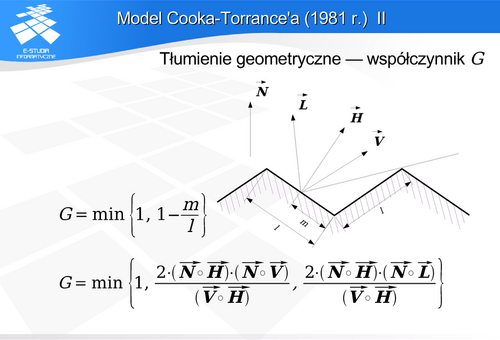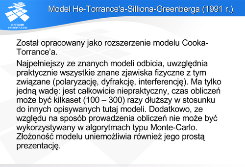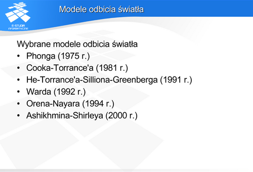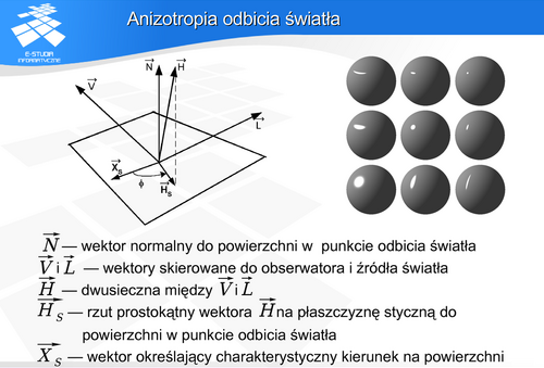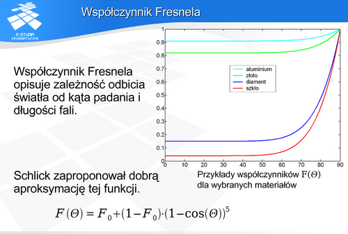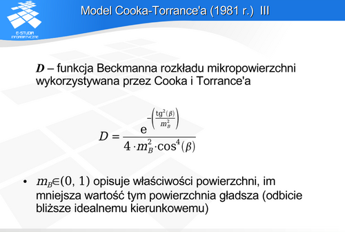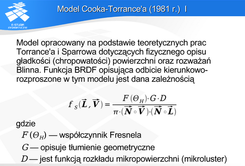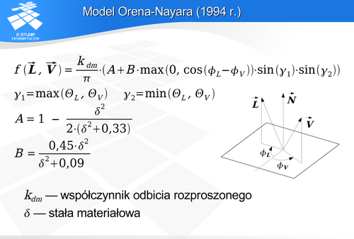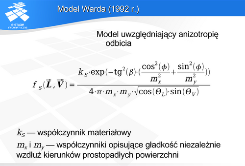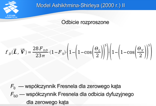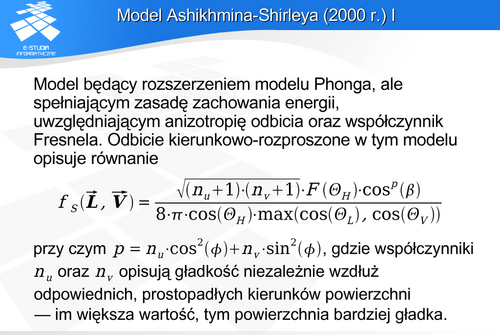 Jednocześnie trzeba podkreślić, że jest to inne podejście do opisu odbicia rozproszonego niż w modelu Orena i Nayara. W modelu Ashikhmina I Shirleya wykorzystano opis oparty na pomyśle Schlicka aproksymacji wielomianowej.