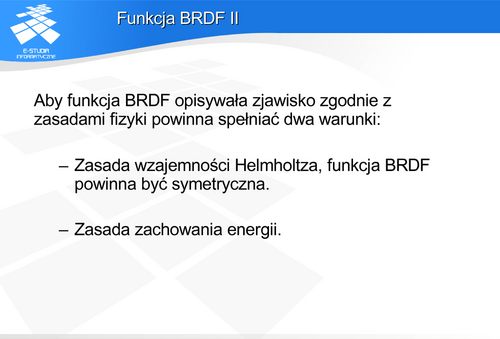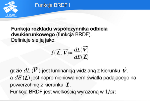 charakteryzuje dany materiał (właściwości odbiciowe powierzchni). Warto zwrócić uwagę na właściwości tej funkcji. Idealne odbicie kierunkowe to takie, w którym odbicie występuje tylko dla zerowego kąta