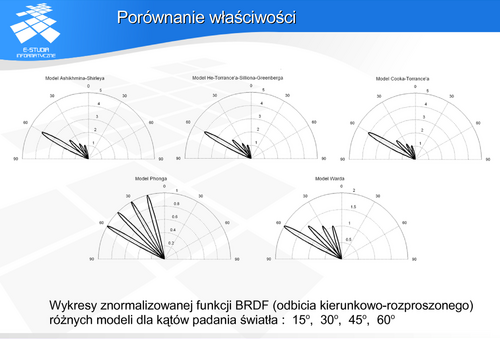 Jak widać modele Cooka-Torrance’a, Ashikhmina-Shirleya, He-Torrance’a-Silliona-Greenberga i Warda wykazują zbliżone kształty funkcji BRDF dla różnych kątów padania światła. Przy czym zależności Warda dają inne proporcje zależności kątowych. Model ten nie uwzględnia współczynnika Fresnela. Stąd wartości maksymalne w opisie Warda odbiegają od wartości w modelachCooka-Torrance’a, Ashikhmina-Shirleya, He-Torrance’a-Silliona-Greenberga. Jako punkt odniesienia przyjmuje się model He-Torrance’a-Silliona-Greenberga. Badania doświadczalne pokazały, że najlepiej opisuje on zachowanie rzeczywistych powierzchni. Niemniej jednak ze względu na złożoność obliczeniową i jednocześnie bardzo zbliżone właściwości (rysunek) modele Cooka-Torrance’a orazAshikhmina-Shirleya są atrakcyjniejsze. Warto pamiętać jednocześnie, że model He-Torrance’a-Silliona-Greenberga nie może być stosowany w odmianach metody śledzenia promieni, gdzie wymagana jest funkcja gęstości prawdopodobieństwa. Model Phonga nie pasuje do pozostałych, gdyż w ogóle nie uwzględniono w nim ani kąta padania, ani współczynnika Fresnela.