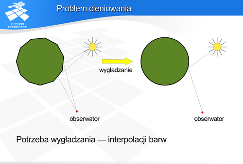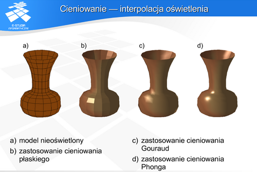 - Cieniowanie płaskie (cieniowanie stałą wartością), gdy cały wielokąt jest wypełniony taką samą barwą.