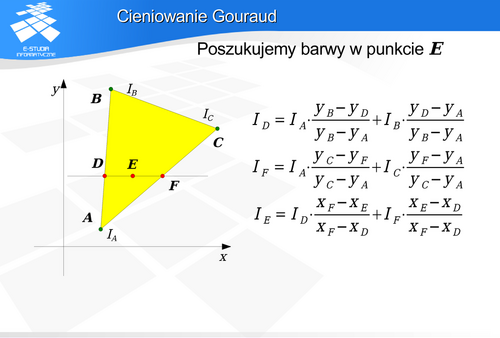 W pierwszym etapie wyznaczamy (hipotetyczną) barwę w wierzchołkach wielościanu. W tym celu wyznaczamy hipotetyczny wektor normalny jako średnią arytmetyczną wektorów normalnych wszystkich ścian, do których ten wierzchołek należy. Następnie na podstawie wektora normalnego wyznaczamy barwę wierzchołka korzystając z wybranego modelu odbicia światła. W drugim etapie dokonywana jest liniowa interpolacja barwy zgodnie z zaprezentowanymi wzorami.