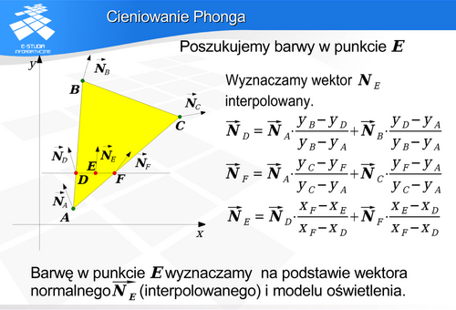 W pierwszym etapie wyznaczamy wektor normalny w wierzchołku w ten sam sposób jak w cieniowaniu Gouraud. W drugim etapie wyznaczamy interpolowany wektor normalny dla każdego piksela (to znaczy dla punktu powierzchni odpowiadającego pikselowi). Następnie wyznaczamy barwę piksela, na podstawie interpolowanego wektora normalnego korzystając z wybranego modelu odbicia światła.