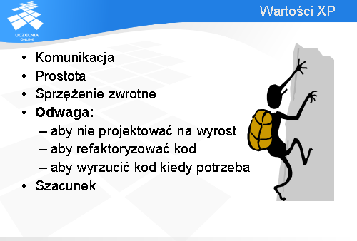 Podsumujmy. Najważniejsze wartości XP to: komunikacja, prostota, sprzężenie zwrotne, odwaga, szacunek.