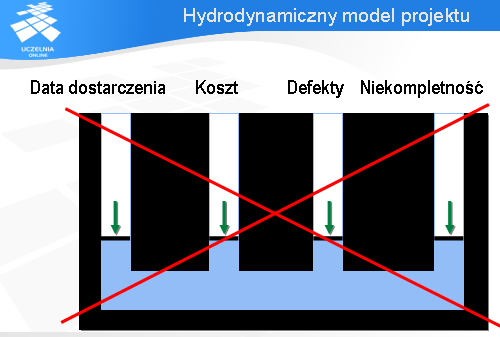 Projekt informatyczny można zobrazować jako szczelny system hydrodynamiczny 4 zmiennych: daty dostarczenia, kosztu, defektów oraz niekompletności funkcji.
