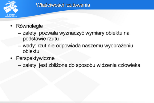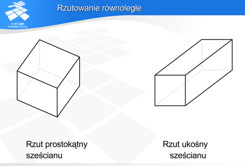 to promienie rzutujące zamiast pęku prostych utworzą proste równoległe i uzyskamy rzutowanie równoległe prostokątne. O rzutowaniu równoległym można powiedzieć, że jest szczególnym przypadkiem rzutowania perspektywicznego, gdy środek rzutowania znajduje się w nieskończoności.