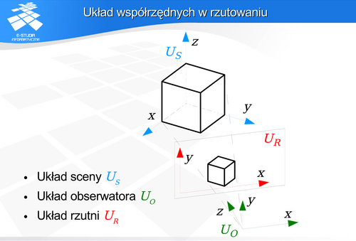 Ponieważ położenie przedmiotów wyimaginowanego świata jest opisywane w układzie prawoskrętnym, to zachodzi konieczność nie tylko związania położenia obserwatora i kierunku rzutowania z układem świata, ale także zapewnienia zmiany skrętności układu. Trzeba o tym pamiętać definiując macierze opisujące odpowiednie operacje. Mówimy o układzie współrzędnych obiektu (sceny lub świata) i przestrzeni obiektu oraz układzie obserwatora (lub rzutu) i przestrzeni obserwatora. Takie rozdzielenie funkcjonalne znacznie ułatwia manipulację i definiowanie odpowiednich parametrów. Dodatkowo mówimy o układzie współrzędnych rzutni opisującym położenie elementów rzutu.