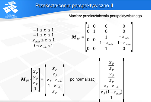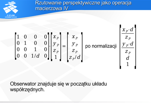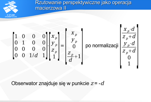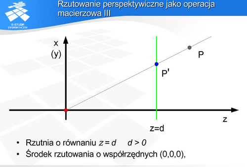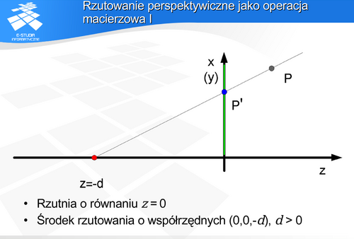 , który zgodnie z definicją rzutu perspektywicznego będzie należał do płaszczyzny rzutni i jednocześnie do prostej przechodzącej przez środek rzutowania i punkt . Uwzględniając proste zależności geometryczne można pokazać, że macierz opisująca tak zdefiniowane rzutowanie perspektywiczne ma następującą postać: