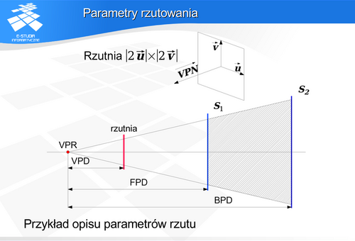 definiuje jednoznacznie ostrosłup prawidłowy o podstawie prostokąta. Daje to możliwość określenia kąta patrzenia w rzutowaniu perspektywicznym. Komplet parametrów rzutowania wymaga definicji: środka rzutowania (punkt VPR) oraz trzech odległości wzdłuż osi optycznej względem środka rzutowania. Pierwszą jest odległość do płaszczyzny rzutni (VPD). Dwie pozostałe (FPD i BPD) definiują położenie dwóch płaszczyzn (przedniej