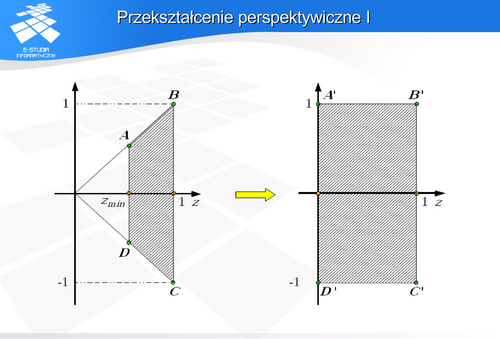 Jeśli rozpatrzymy znormalizowaną bryłę widzenia perspektywicznego – ostrosłup ścięty, to promienie rzutujące tworzą pęk prostych w wierzchołku tego ostrosłupa. Można dokonać przekształcenia, które przekształci ostrosłup ścięty na prostopadłościan. Wtedy pęk prostych (promieni rzutujących) stanie się zbiorem prostych równoległych. A to oznacza, że po takim zniekształceniu przestrzeni wszystkie punkty leżące na prostej rzutującej będą miały jednakowe współrzędne odpowiadające współrzędnym rzutu.