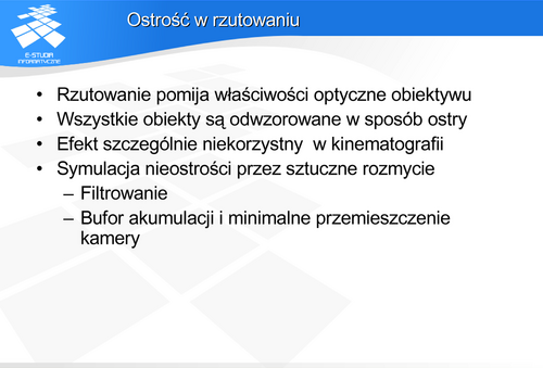 Stosowanym rozwiązaniem jest sztuczne rozmycie symulujące nieostrość w wybranych fragmentach obrazu. Dokonuje się tego albo stosując bufor akumulacji albo odpowiednie filtrowanie. Więcej na ten temat zainteresowani mogą przeczytać w pracy: Rokita P.: Problemy łączenia obrazów generowanych metodami grafiki komputerowej z obrazami rzeczywistymi. Prace naukowe. Elektronika. Politechnika Warszawska 2001.