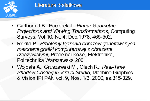 Jak widać współrzędne x i y obrazu punktu odpowiadają współrzędnym rzutu perspektywicznego przy założeniu, że środek rzutowania jest w początku układu współrzędnych. Jednocześnie współrzędna z obrazu daje informację o położeniu względem osi OZ. Warto zwrócić uwagę na fakt, że przekształcenie wartości głębokości jest operacją nieliniową, ale zachowującą porządek na prostej, co w zupełności wystarcza do oceny głębokości.