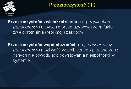 Przezroczystość współbieżności gwarantuje, że współbieżne odwoływanie się do tego samego zasobu realizowane przez wielu użytkowników nie będzie prowadziło do powstania stanu niespójnego w systemie. Stan spójny można osiągnąć poprzez blokowanie dostępu do wspólnych danych (gwarantujące wyłączny dostęp) lub poprzez zastosowanie mechanizmu przetwarzania transakcyjnego, które jednak jest trudne do zrealizowania w systemie rozproszonym.