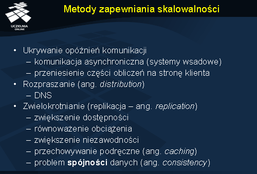 Skalowalność pod względem rozmiaru może być ograniczona poprzez stosowanie rozwiązań scentralizowanych. Każdy serwer, który jest jedynym pełniącym określoną funkcję, staje się wąskim gardłem w warunkach wzrastającej liczby żądań. Stosowanie przetwarzania scentralizowanego staje się niekiedy jednak nieuniknione. Przykładem może być przechowywanie poufnych danych, których powielenie powodowałoby zwiększenie ryzyka ich ujawnienia (centralizacja danych). Z centralizacją usług mamy do czynienia wtedy, gdy przetwarzanie zleceń jest realizowane przez pojedynczy serwer. Dobrym przykładem usługi, która jest doskonale zdecentralizowana jest usługa DNS (ang. Domain Name Service ), zajmująca się m.in. odwzorowaniami nazw domenowych na adresy IP. W usłudze tej grupa rozproszonych serwerów realizuje wspólnie wspomnianą funkcję. Rozproszenie przetwarzania jest tu koniecznością, ponieważ liczba żądań przychodzących do systemu jest tak duża, że żaden serwer nie byłby w stanie jej obsłużyć.