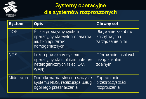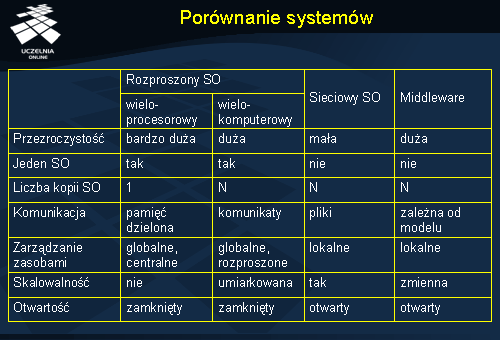 Przedstawione w tabeli klasy systemów operacyjnych pokazują, że w praktyce nie ma systemów idealnych, a więc takich, które jednocześnie oferowałyby wysoką przezroczystość, były otwarte, wysoko wydajne i oferowały dobrą skalowalność. Systemy wieloprocesorowe nie są otwarte, ale za to bardzo efektywne, bo ten właśnie aspekt jest w nich najważniejszy. Sieciowe systemy operacyjne są otwarte i skalowalne, ale stosowane w nich mechanizmy komunikacyjne nie są zbyt wygodne i nie oferują one zadowalającej przezroczystości. Systemy oparte na warstwie pośredniej oferują dużą przezroczystość, ale kosztem jest tu ograniczona skalowalność.