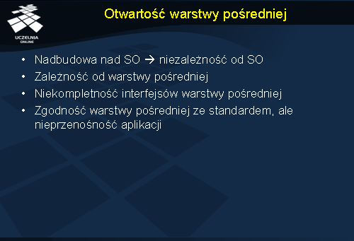 Oprogramowanie warstwy pośredniej jest budowane najczęściej dla pewnego zbioru systemów operacyjnych, a więc jego zastosowanie powinno nas uniezależnić od systemu operacyjnego. W praktyce jednak aplikacje muszą wykorzystywać interfejsy warstwy pośredniej, co powoduje powstanie zależności od tej warstwy. Nawet jeżeli interfejsy warstwy pośredniej zostały ustandaryzowane, nie daje to gwarancji przenośności aplikacji między różnymi implementacjami tego standardu. Wynika to z jednej strony z niekompletności interfejsów, powodujących konieczność odwoływania się bezpośrednio do systemu operacyjnego, a z drugiej strony z niezgodności zastosowanych protokołów (pomimo zgodności interfejsów).