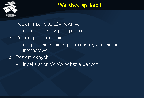 Przykład: wyszukiwarka internetowa. Interfejsem użytkownika w tym przypadku jest dokument HTML wyświetlany w przeglądarce. Po wysłaniu żądania do serwera następuje jego przetwarzanie, polegające na interpretacji zapytania, wyszukaniu surowych odpowiedzi, ich poklasyfikowaniu i przygotowaniu odpowiedzi w postaci odpowiedniego dokumentu HTML. Realizacja zapytania wymaga w tym przypadku sięgnięcia do bazy danych przechowującej indeks zawartości stron WWW w Internecie.