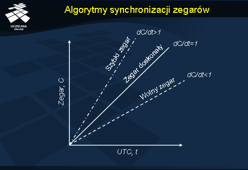 Do rozwiązania tych problemów istnieje wiele algorytmów, z których część zaprezentujemy w dalszej części wykładu. W tym momencie omówimy pewien wspólny dla tych algorytmów model systemu związanego z pomiarem czasu. W modelu tym zakładamy istnienie pewnego idealnego zegara. Oznaczmy dla wygody jego wartość jako t . Każda maszyna, która posiada czasomierz wyznacza czas o wartości C . Jeżeli maszyna p ma za zadanie wyznaczać czas t , wartość jej czasu oznaczamy jako Cp(t ). W tym momencie może wystąpić kilka przypadków. W wypadku kiedy Cp(t ) = t mamy do czynienia z sytuacją, w której zegar w maszynie jest zegarem doskonałym (dC/dt = 1 ). W praktyce występuje jednak sytuacja, w której zegary są szybsze lub wolniejsze w stosunku do zegara doskonałego t (dC/dt różne od 1). Takie zegary powinny być poddawane okresowej resynchronizacji.