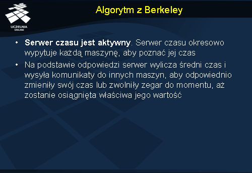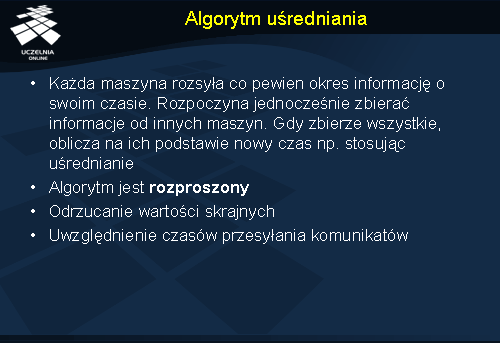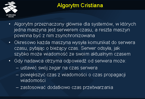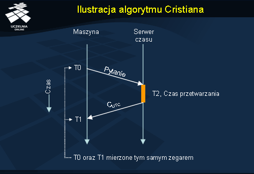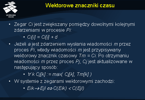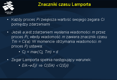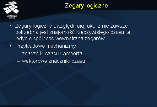 W dalszej części wykładu zostaną omówione algorytmy synchronizacji zegarów logicznych za pomocą znaczników czasu Lamporta i wektorowych znaczników czasu.