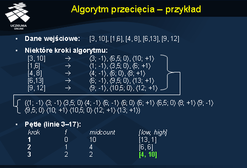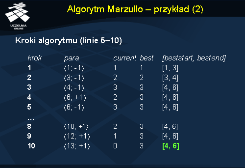 Na slajdzie przedstawiono szczegóły algorytmu, a tutaj opiszemy znaczenie poszczególnych zmiennych użytych w algorytmie: best – największa dotychczasowa liczba nakładających się przedziałów; current – bieżąca liczba nakładających się przedziałów; [ beststart , bestend ] – najlepszy znaleziony do tej pory przedział; i – pewien indeks; offset[i ] – znacznik czasowy pary o indeksie i ; type[i ] – typ pary o indeksie i .