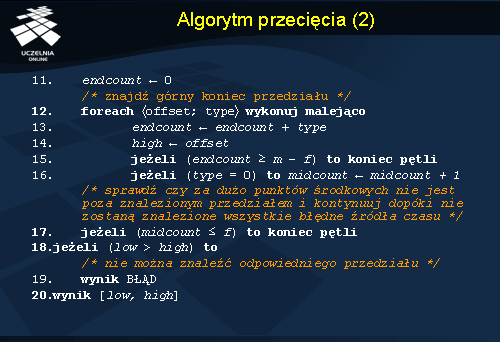 Jak wspomniano działanie algorytmu polega na próbie znalezienia przedziału spójnego z m-f źródłami czasu. Przed rozpoczęciem głównej części algorytmu jest tworzona posortowana lista wszystkich dostępnych par, które reprezentują dostępne przedziały czasowe. Sortowanie odbywa się analogicznie jak w algorytmie Murzallo. Algorytm wykonuję się w pętli z rosnącą wartością f . Na początku zakłada się, że nie ma błędnych źródeł czasu, czyli f = 0 . Pętla wykonuje się do momentu kiedy zostanie znaleziony zadowalający przedział lub wartość f będzie równa bądź większa od m/2 . Wewnątrz głównej pętli wykonywane są dwie mniejsze pętle, z których jedna szuka dolnego końca przedziału wynikowego, a druga górnego końca przedziału wynikowego. W skrócie można napisać, iż jedna pętla przegląda na liście pary <znacznik czasowy, typ> w kolejności rosnącej, a druga pętla robi to w kolejności malejącej. Każda z pętli kończy się w momencie, gdy liczba rozpatrzonych przez nie przedziałów mających wspólną część będzie równa lub większa od wartość m-f . Pod koniec obu pętli sprawdzane jest czy liczba środków przedziałów znajdujących się poza przedziałem wynikowym nie przekracza liczby f błędnych źródeł czasu. Jeżeli nie przekracza główna pętla jest kończona i otrzymujemy odpowiedni wynik.