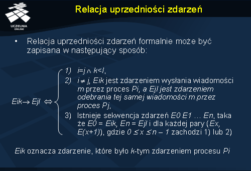 Niech zdarzenie a poprzedza zdarzenie b . Relacja uprzedniości zdarzeń zachodzi w następujących przypadkach. Zdarzenia a i b działają wewnątrz tego samego procesu oraz a występuje przed b . W drugim przypadku a jest zdarzeniem wysłania komunikatu przez pewien proces, a b jest zdarzeniem odebrania tego komunikatu przez inny proces. Trzeci przypadek opisuje domknięcie przechodnie relacji uprzedniości. Mówimy, że zdarzenie a poprzedza zdarzenie b gdy istnieje sekwencja zdarzeń rozpoczynająca się od zdarzenia a i kończąca zdarzeniem b , taka że dla każdej pary kolejnych zdarzeń zachodzi jedna z dwóch wcześniej opisanych sytuacji.