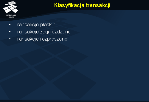 Transakcje można podzielić na: transakcje płaskie (najprostsze), transakcje zagnieżdżone oraz transakcje rozproszone. Kolejne slajdy omawiają poszczególne typy transakcji.