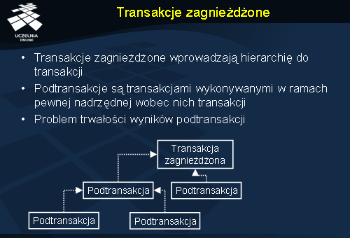 Transakcja zagnieżdżona jest złożona z pewnej liczby podtransakcji (ang. subtransaction ). Każda transakcja w ramach transakcji zagnieżdżonej może również zawierać swoje podtransakcje itd. Podtransakcje mogą być wykonywane na różnych maszynach, jeżeli pozwoli to np. na zwiększenie efektywność przetwarzania.