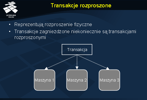 W powyższym przykładzie pojawił się jednak jeszcze jeden istotny element, którego nie analizowaliśmy: rozproszenie całego systemu. Transakcje zagnieżdżone nie stanowią od razu o tym, że dana transakcja działa w środowisku rozproszonym. Stanowi ona jedynie pewien sposób organizacji pracy systemu. W celu wyróżnienia transakcji, które działają na różnych maszynach, wprowadzono pojęcie transakcji rozproszonych (ang. distributed transactions).