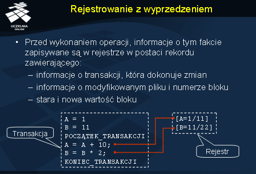 W momencie gdy transakcja zostaje zatwierdzona, do wspomnianego rejestru wpisywany jest tylko fakt samego zatwierdzania, gdyż dane zostały już wcześniej zaktualizowane. Kiedy jednak transakcja zostaje anulowana, przydatny okazuje się rejestr, który służy do przywrócenia stanu sprzed transakcji. Operacja przywracania polega w skrócie na odczytaniu od końca rekordów rejestru i wycofaniu (ang. rollback ) zapisanych w nim zmian.