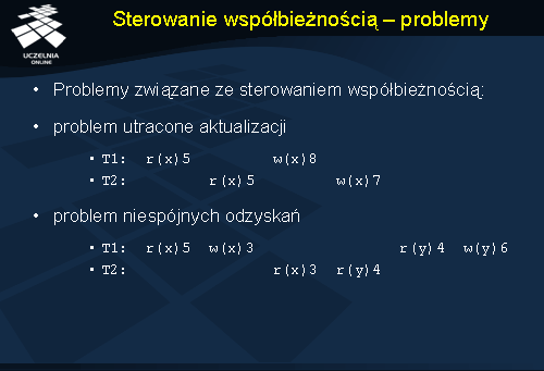 Zilustrujmy teraz problem utraconej aktualizacji na przykładzie dwóch współbieżnych transakcji, dokonujących operacji na wspólnej danej. Przypuśćmy, że istnieje pewna dana x równa 5, do której transakcja T1 chce dodać wartość 3, a transakcja T2 chce dodać wartość 2. Załóżmy, że scenariusz wykonania obu transakcji wygląda następująco: transakcja T1 odczytuje wartość x , chwilę później wartość x odczytuje transakcja T2 , transakcja T1 dodaje do x wartość 3, transakcja T2 dodaje do x 2. Ostatecznie wszystkie te operacje sprawiły, że x jest równy 7, mimo że powinien wynieść 10. Stało się tak dlatego, iż wartości x jaką modyfikowała transakcja T2 była nieaktualna w momencie zapisu. Innymi słowy transakcja T2 polegała na odczycie, który był nieaktualny.