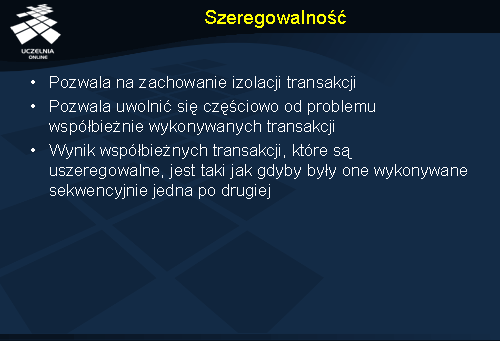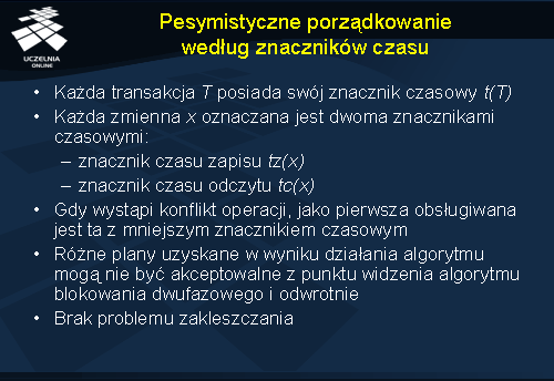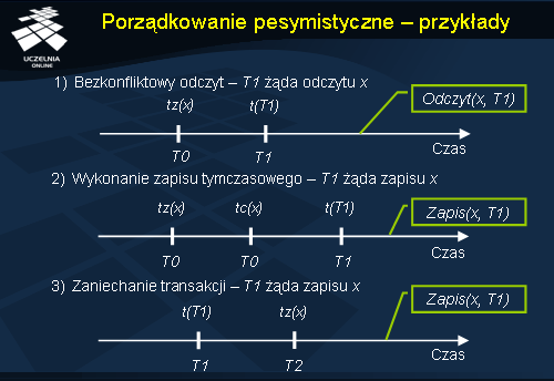 Podobna sytuacja występuje dla operacji zapisu. Po nadejściu zlecenia zapisu, porównujemy wartości t oraz tc(x ). Jeśli t < tc(x ), transakcja zostaje zaniechana, gdyż zmienna x została w tym przypadku odczytana po rozpoczęciu transakcji T . Gdy zachodzi natomiast sytuacja odwrotna operacja może być wykonana, a wartość tz(x ) odpowiednio ustawiona na max[t , tz(x )].